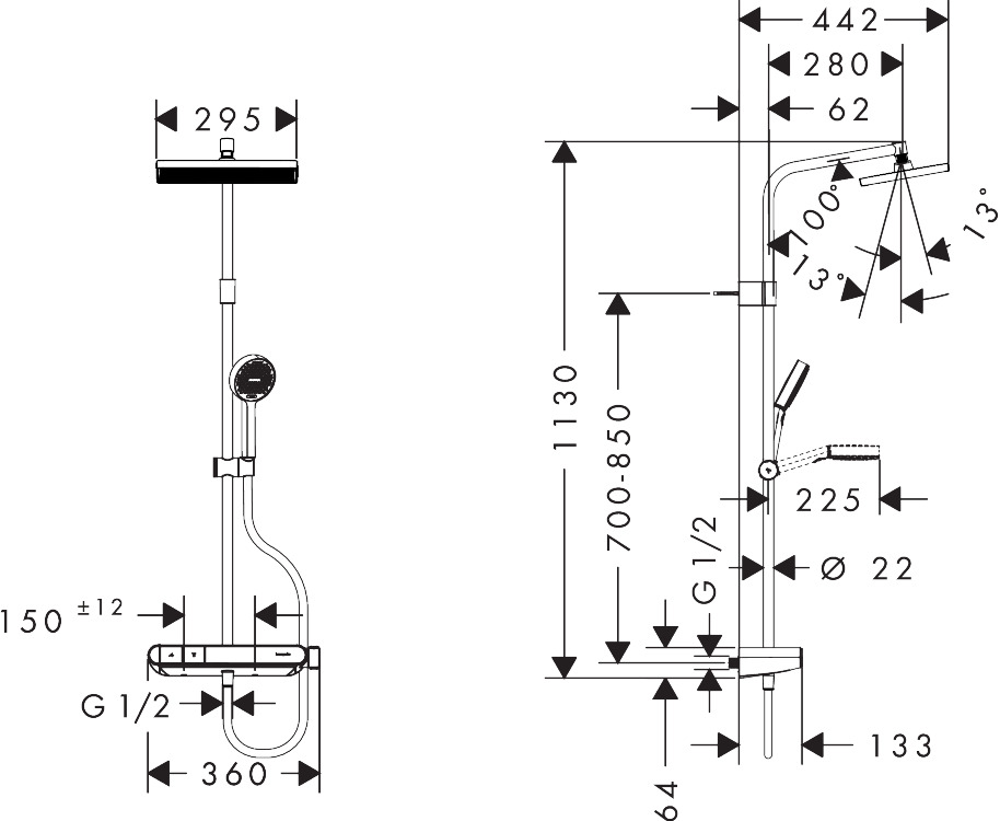 - consists of: overhead shower, hand shower, shower thermostat, shower bar, slider, shower hose
